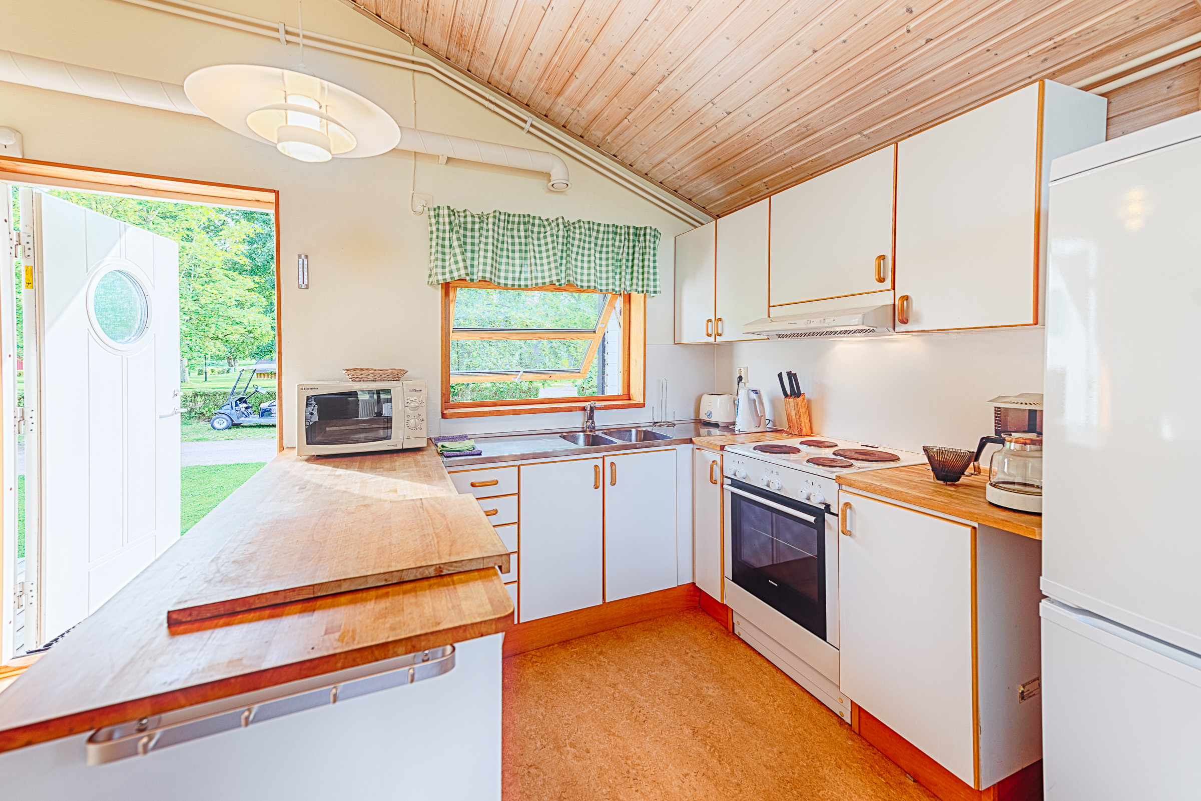 I köket finns kyl, frys, spis med ugn, mikrougn, kaffebryggare och porslin för fyra personer.