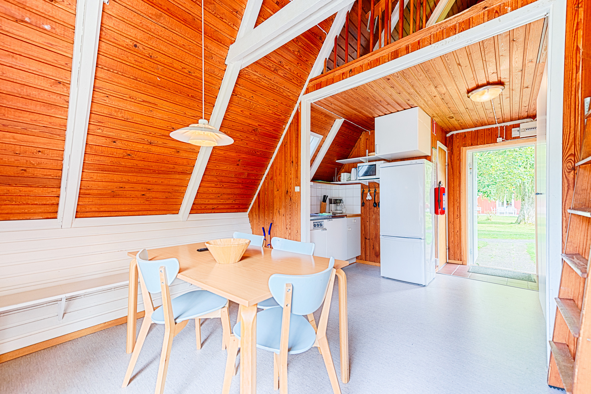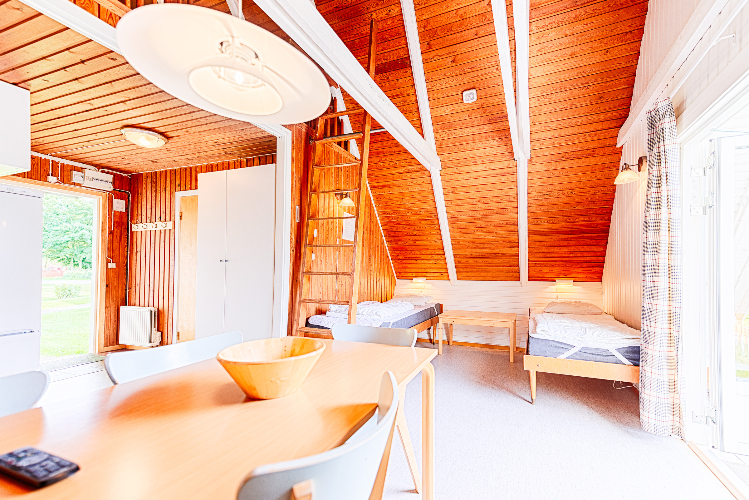 Stugan har allrum/pentry med två enkelsängar, ett sovrum med ytterligare två enkelbäddar och ett sovloft med madrasser för två. En stege leder er till sovloftet. Toalett finns i stugan.